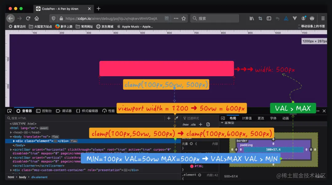 这个时候.element元素的width是500px。此时,clamp(100px, 50vw, 500px)相当于clamp(100px, 600px, 500px),对应的VAL值是600px,大于MAX值,那么这个时候clamp()函数返回的值是MAX,即500px,这个时候.element的width值就是500px(即MAX的值)。
