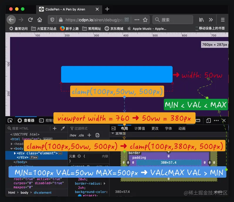 这个时候.element元素的width是50vw。此时,clamp(100px, 50vw, 500px)相当于clamp(100px, 380px, 500px),对应的VAL值是380px,该值大于MIN值(100px),小于MAX值(500px),那么这个时候clamp()函数返回的值是VAL,即50vw,这个时候.element的width值就是50vw(即VAL的值)。
