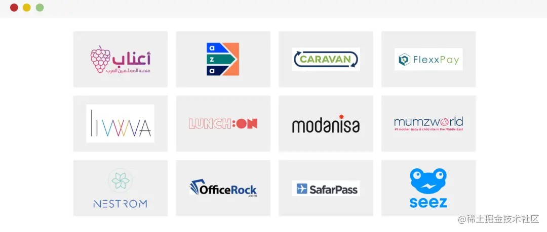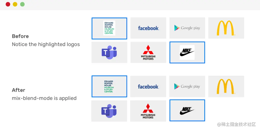这样就能实现上图的效果。你可能发现了,有些Logo图像带有背景颜色,如果让效果更好一些,可以把CSS混合模式相关的特性运用进来:
