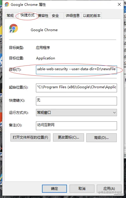 右键Chrome,在属性目标路径中后添加--disable-web-security \--user-data-dir=...