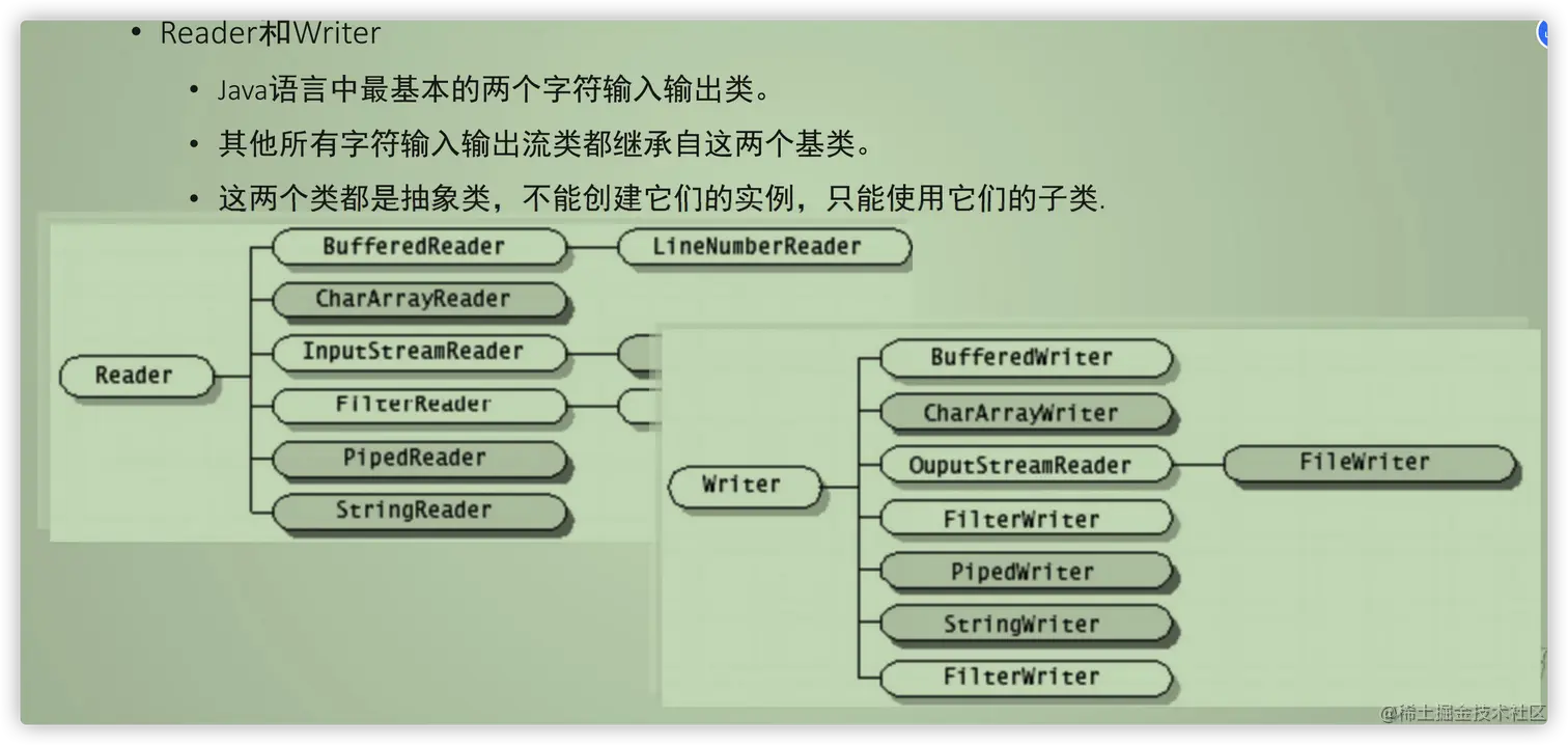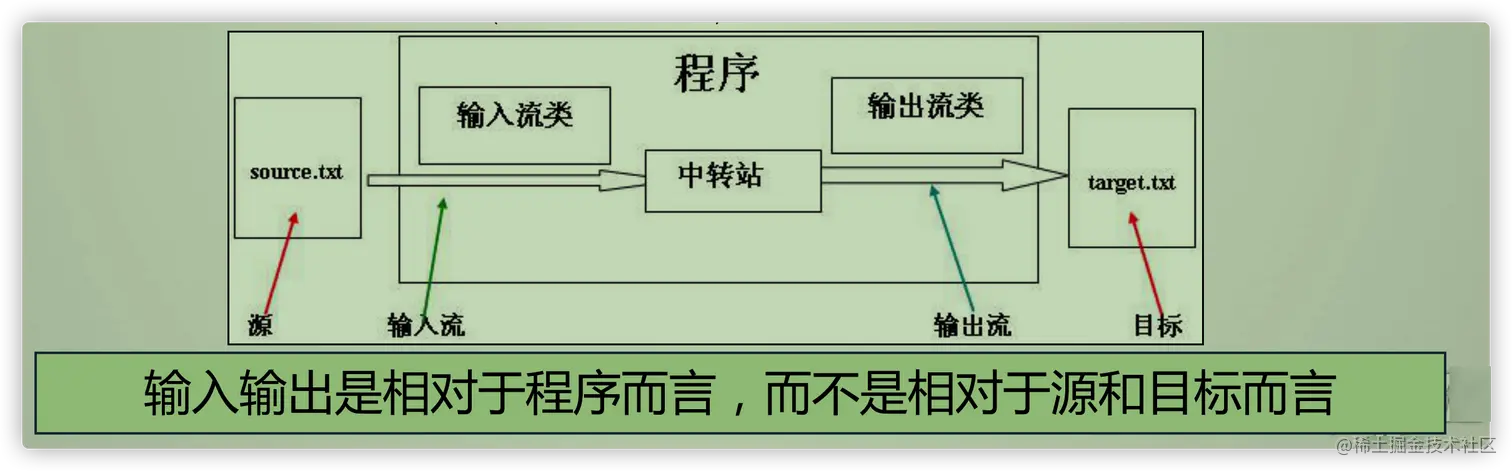 - 输出流:程序到目的地(OutPutStream、Writer写出去)