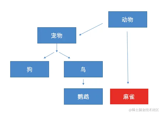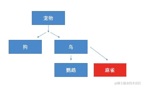 麻雀作为一种鸟类,应该继承鸟,但是如果继承了鸟,就相当于默认了麻雀是一种宠物,这显然是不和逻辑的。麻雀在图中的位置就显得比较尴尬。解决此问题的一般方法如下