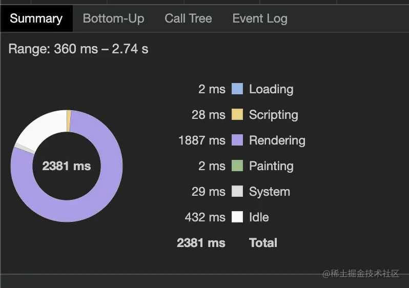 下面有两张图,展示的是渲染性能的差别。图一中是渲染一万个包含a这个字符的span标签,而图二中是渲染一个包含一万个a字符的span标签,可以看出两者之间的性能差异多么大。