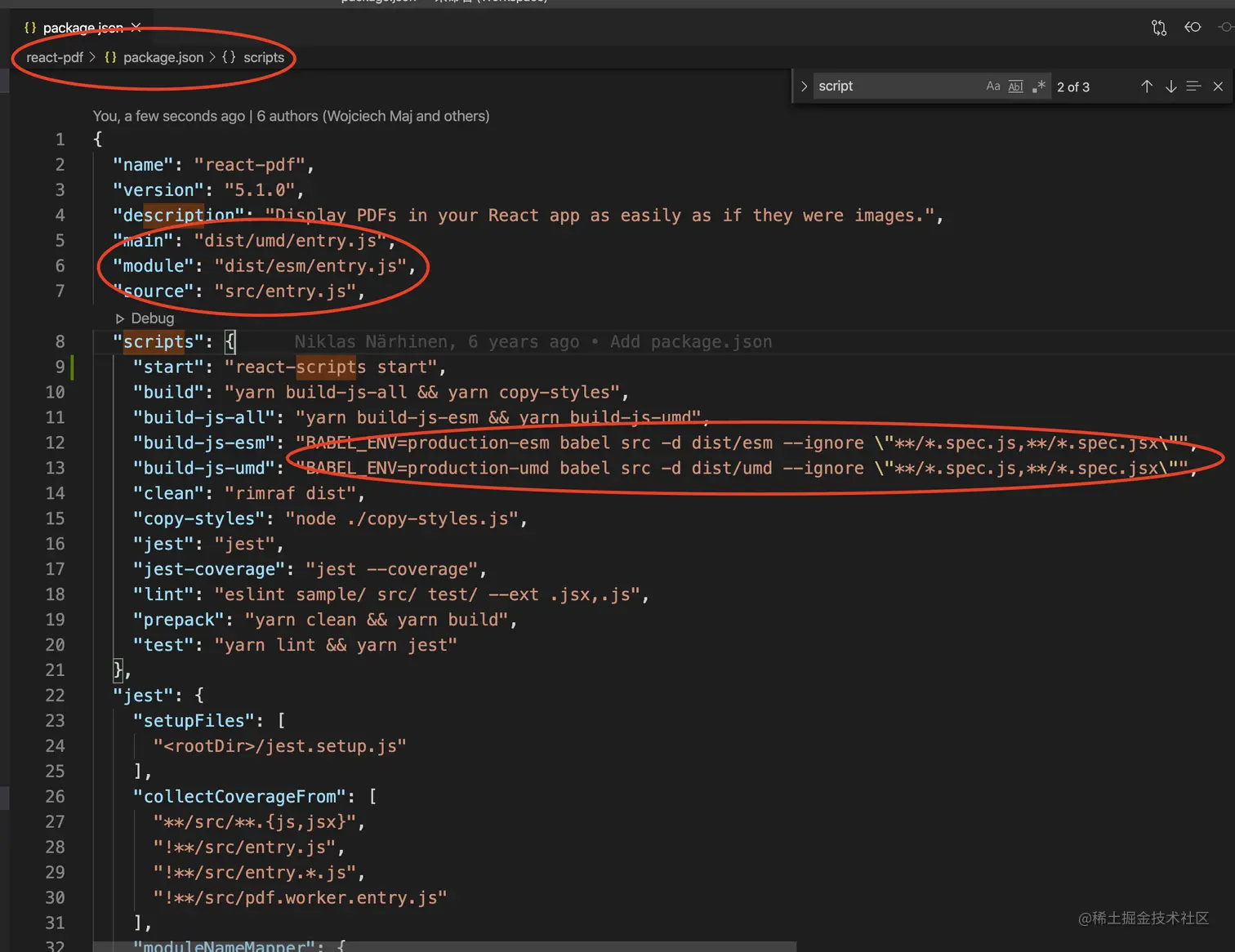 接着分析前端代码,发现展示的部分是使用react-pdf这个库来完成渲染的,于是拉取库的源码,看看是不是库底层的问题。拉取后发现源码是打包发布的,换言之就是类似react、vue的源码一样,并不是直接可以运行到浏览器的项目,这个项目对外暴露的只是几个接口,外部通过这些接口来解析pdf和渲染pdf。从而判断该项目需要先把源码打包,在react工程中添加依赖后引入使用的。