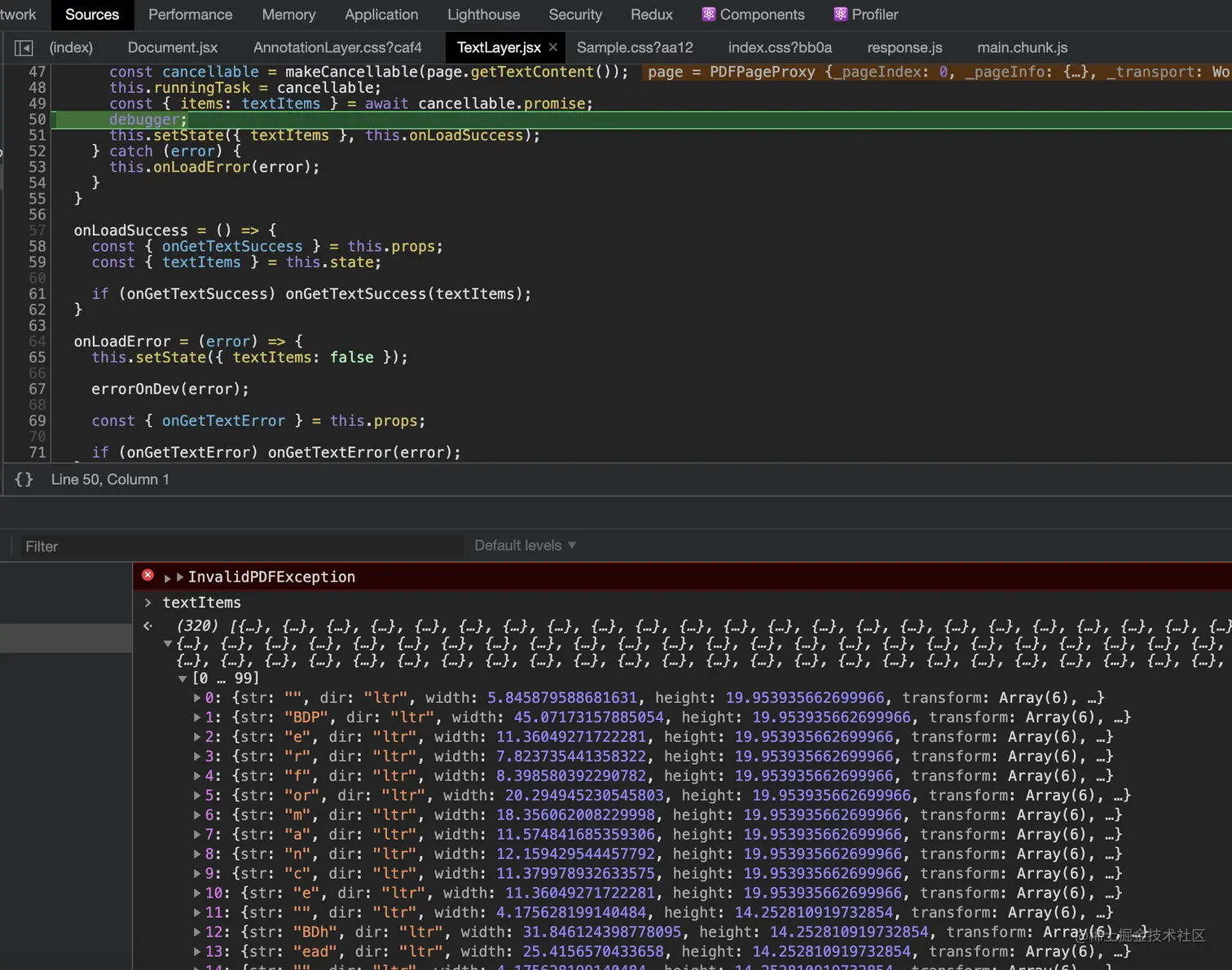 经过前面的分析,初步认为是pdf的解析出现了问题,于是调试的第一步是在解析相关的地方下断点,看看是哪一步花费了大量的时间。由于react-pdf对外暴露的主要接口有两个:Document和Page,于是在下面几个地方下了断点: