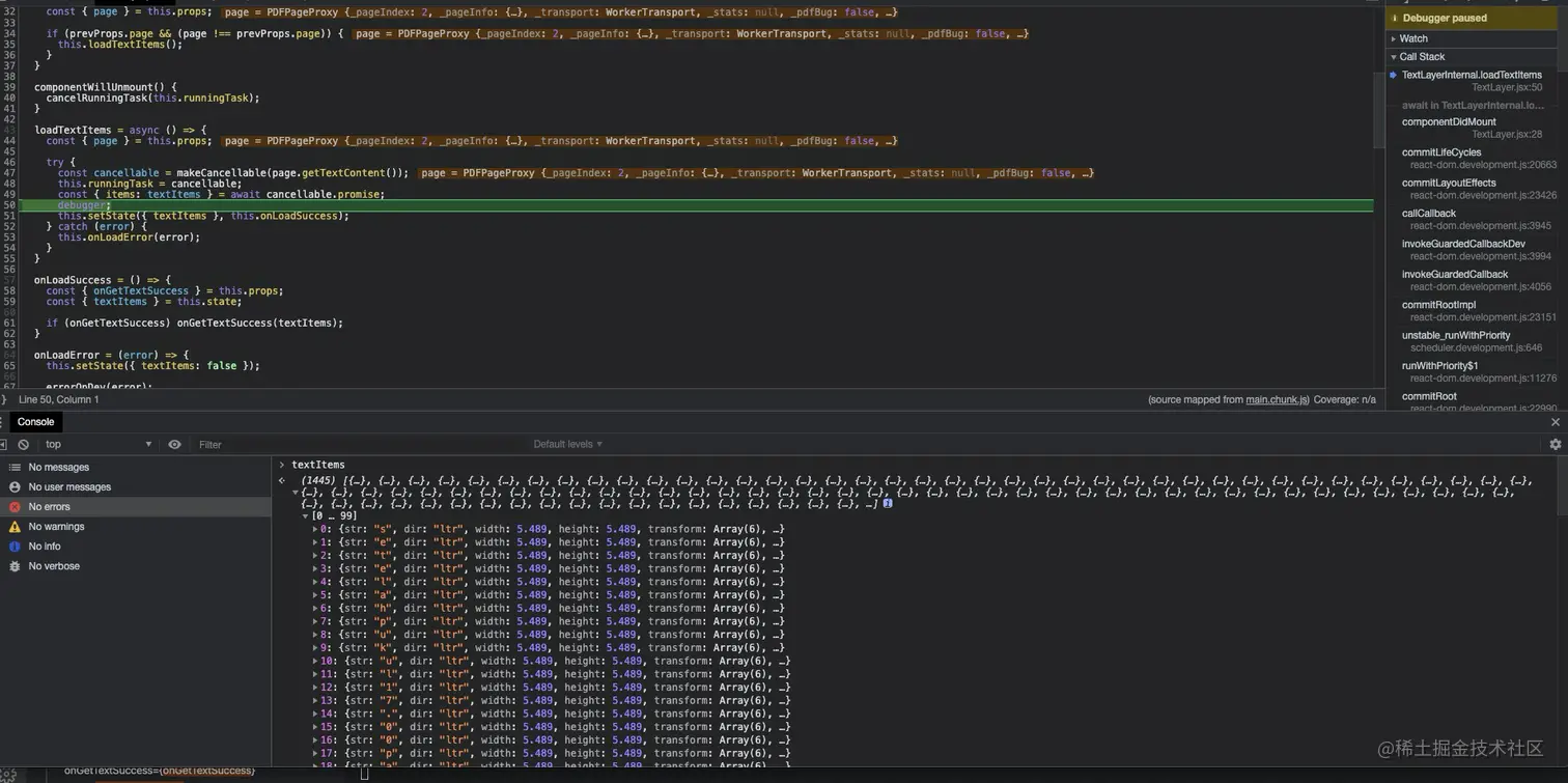 运行项目,便可以本地调试react-pdf的源码了。(其实还有一个方法,就是把react-pdf的源码拷贝到本地,然后通过npm link把源码和项目链接起来,这样就可以运行项目并且调试其中引入的第三方库了)