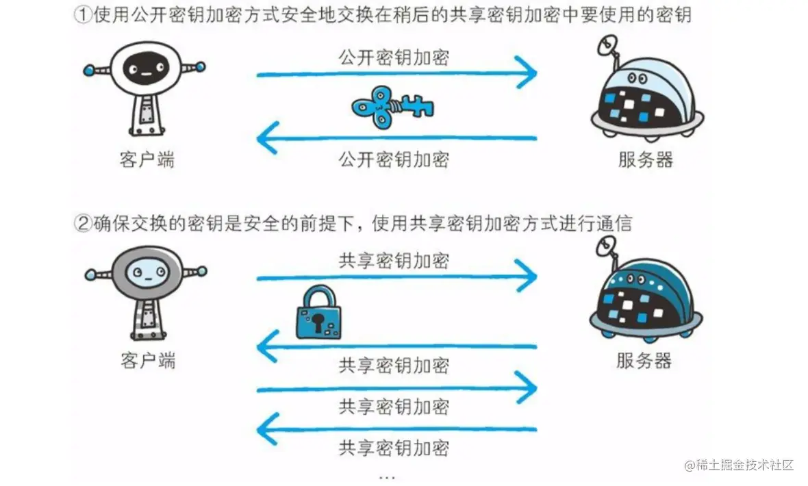 1. 交换密钥阶段: 公开密钥加密(非对称密钥加密)