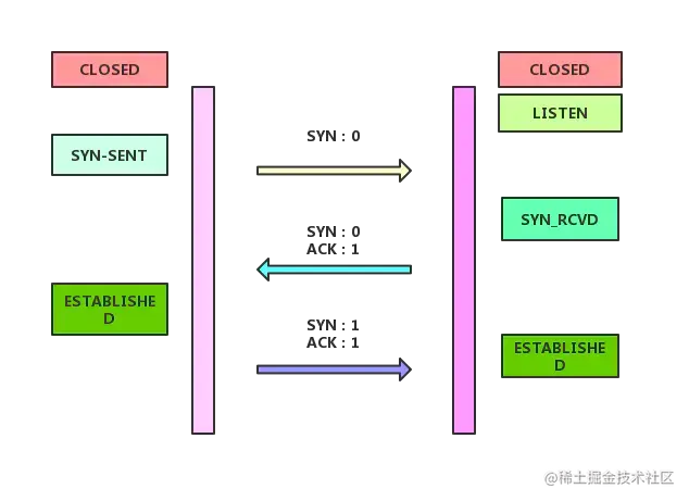 握手过程使用了TCP的标记: SYN(synchronize) 和 ACK(acknowledgement)