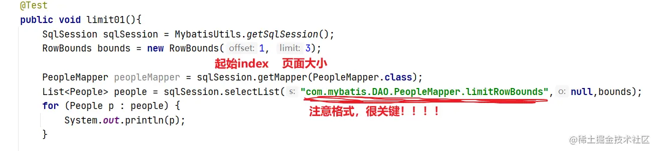 List<People> people = sqlSession.selectList("com.mybatis.DAO.PeopleMapper.limitRowBounds",null,bounds);