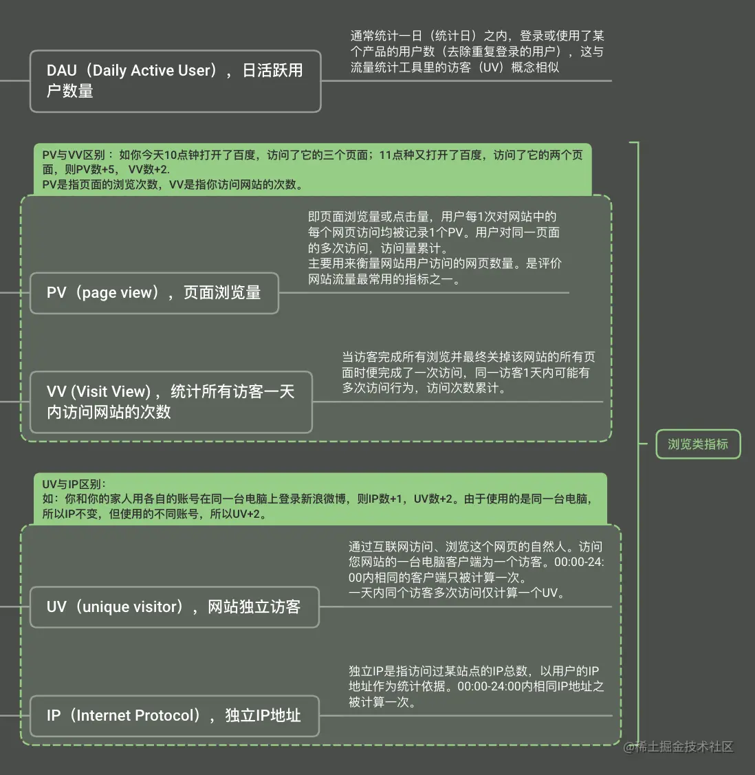 PV 、 UV 是我们经常听到的名词,它们属于浏览类指标,含义和区别我已经替你总结好了,见下图: