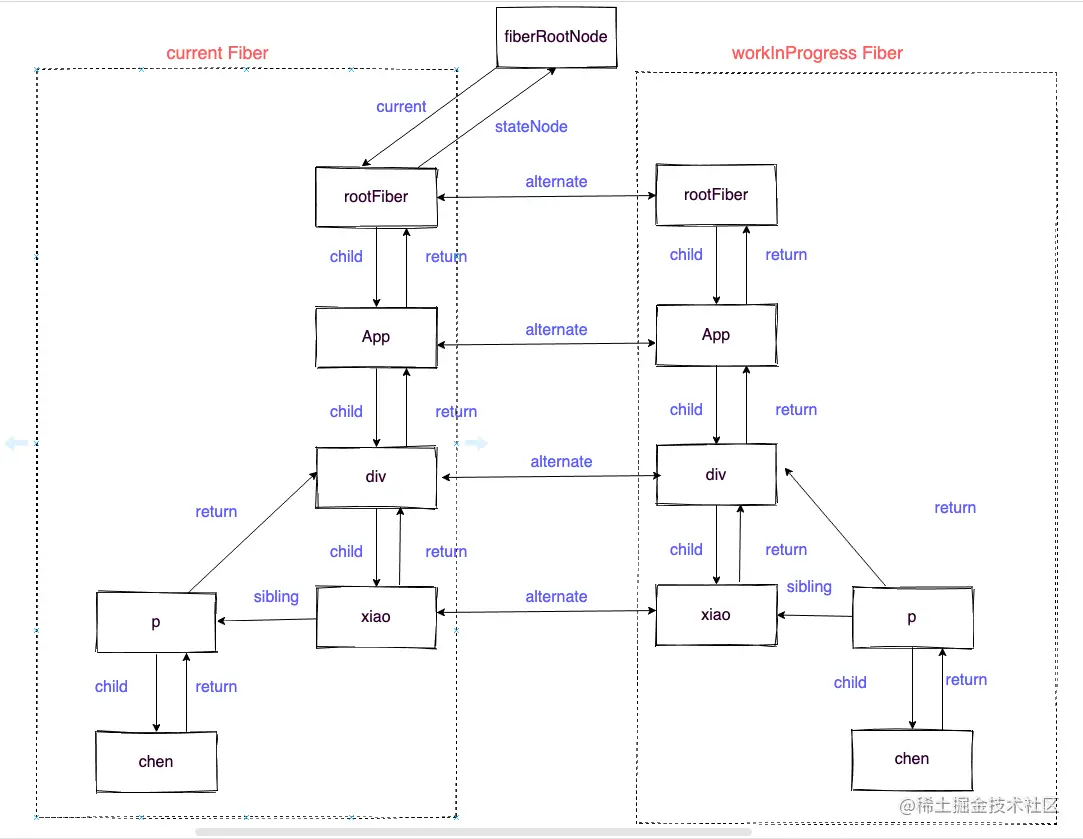 例如下面代码的Fiber双缓存结构如下,在第5章会详细讲解
