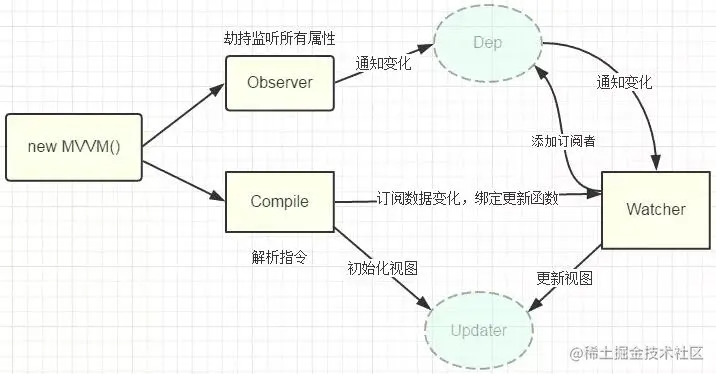 上图大家应该不陌生吧,谈到vue的双向数据绑定原理,去网络上一搜,基本上都能看到这张图,下面我会尝试用个人觉得正确且通俗易懂的话去解释这张图,这张图明白了,自然也就明白了vue的双向数据绑定原理