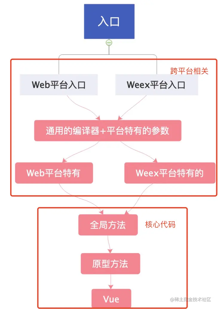 Vue.js整体结构分为三个部分:核心代码、跨平台相关和公用工具函数。