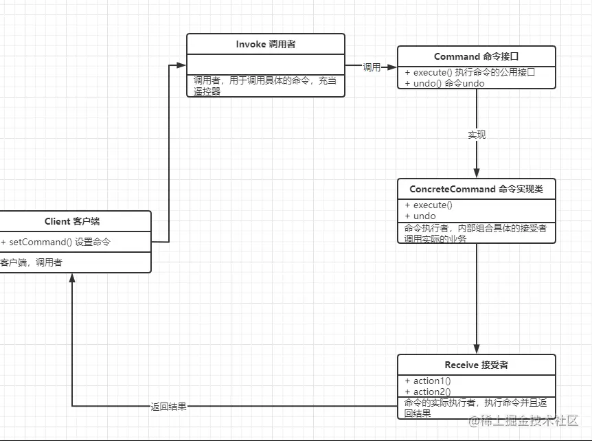 我们从上面的角色图再来看具体的命令模式定义,可以看到基本都是一一对应的情况。