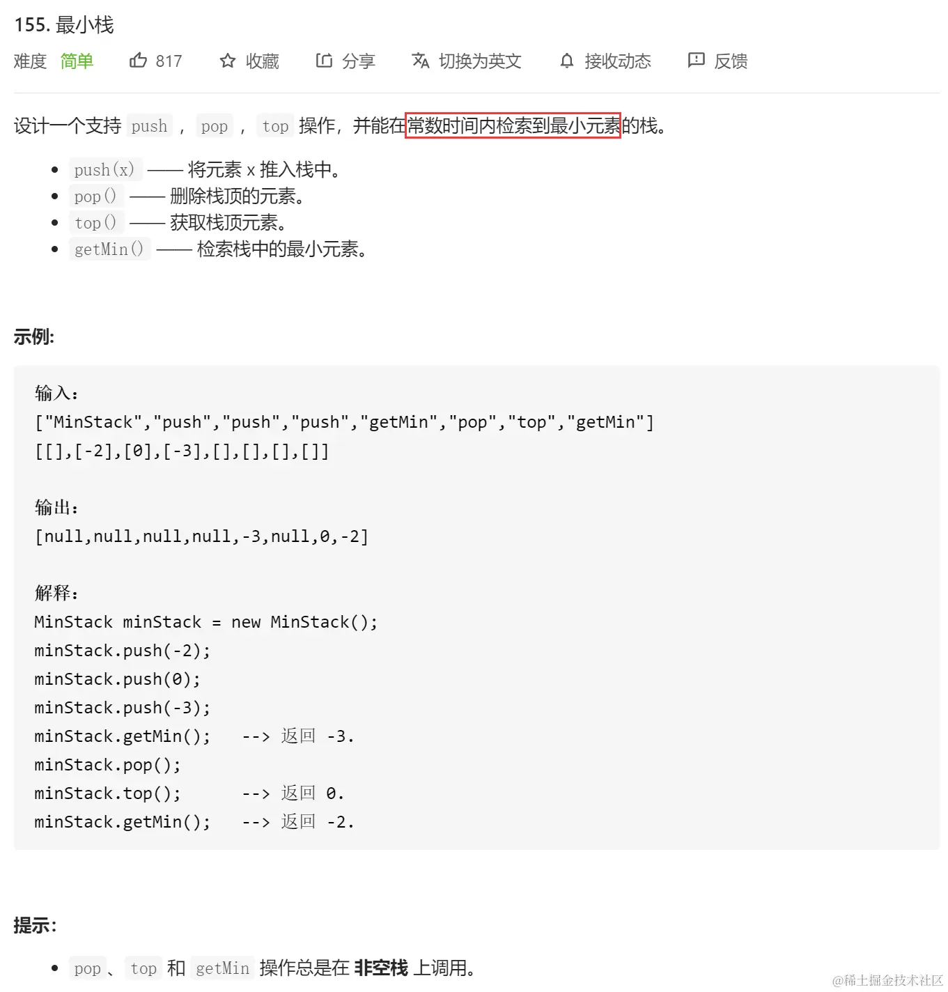 - minstack对应顺序的元素和stack对齐,记录stack中当前位置上的元素该返回的min