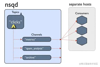 PUB或者SUB一个主题将在nsqd上创建主题。主题元数据接下来将传播到配置的nsqlookupd。其他订阅者将定期查询nsqlookupd来发现此主题。 -