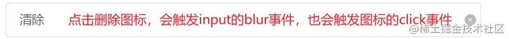 在处理输入框清除输入内容时,遇到了一个问题,当我们在输入框输入内容输入框获取到焦点时,输入框后面会出现一个图标删除已输入的内容,因此删除图标会绑定一个click事件,但是当我们点击图标的时候,也触发了input的blur事件,blur事件会让input失去焦点时隐藏删除的图标,并且blur事件先于图标的click事件执行,因此这时候点击图标并不会删除输入框已输入的内容,而是图标消失了,那么这个结果就不是我们想要的,那怎么解决这个问题呢?