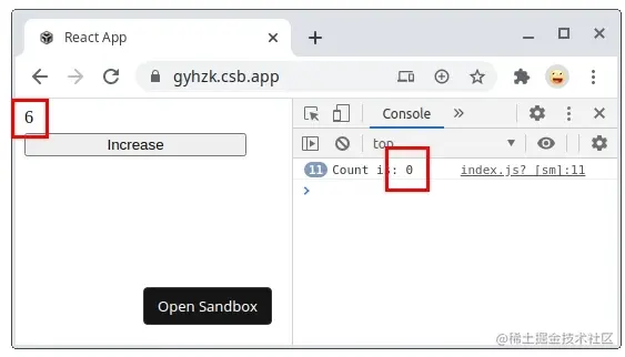 并点击几次增加按钮。然后看看控制台,每2秒出现一次Count is: 0,尽管count状态变量实际上已经增加了几次。