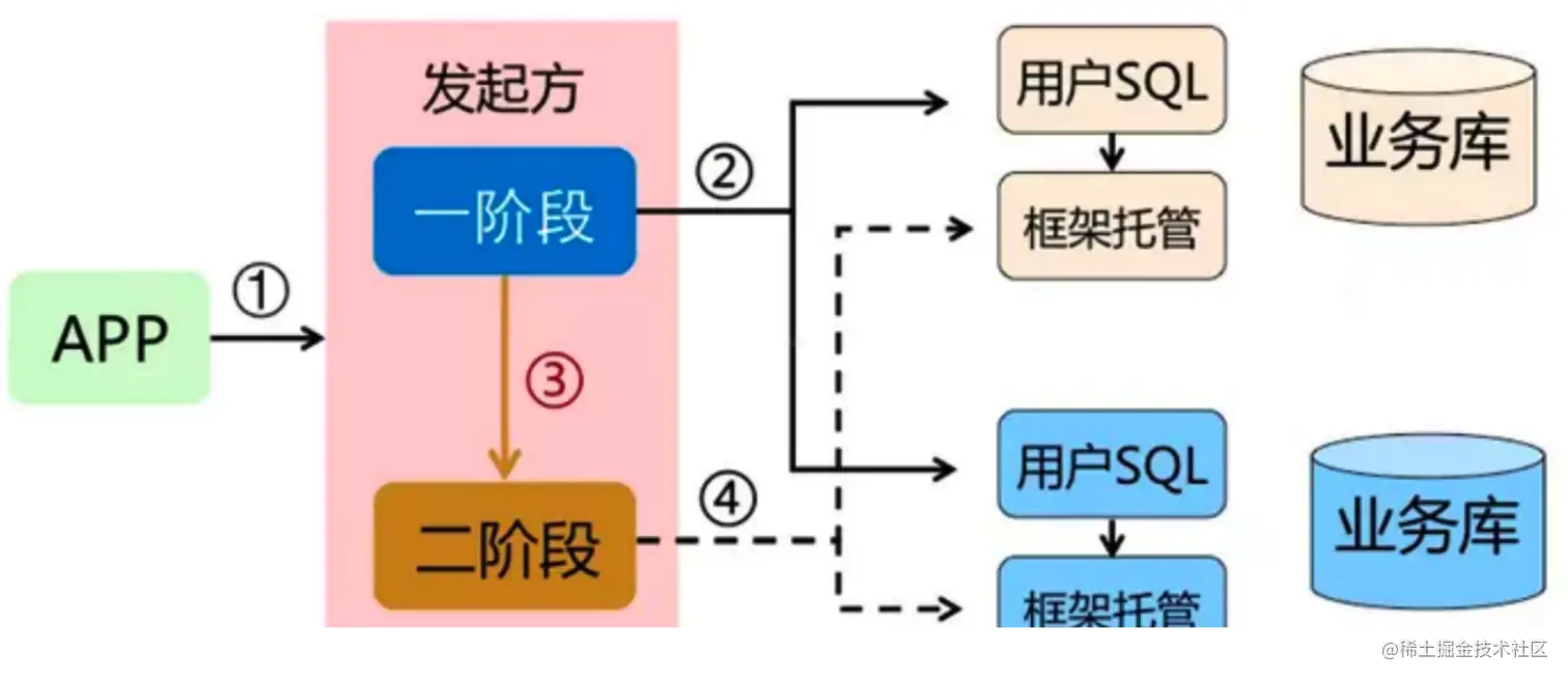 第一阶段,业务数据和回滚日志记录在同一个本地事务中提交,释放本地锁和连接资源。