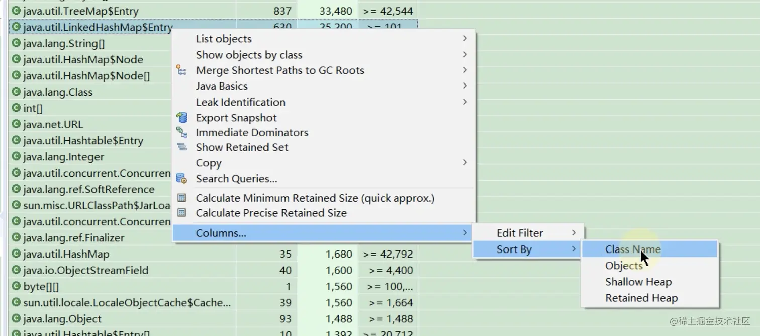 MAT支持一种类似于SQL的查询语言OQL( Object Query Language )。OQL使用类 SQL语法,可以在堆中进行对象的查找和筛选。