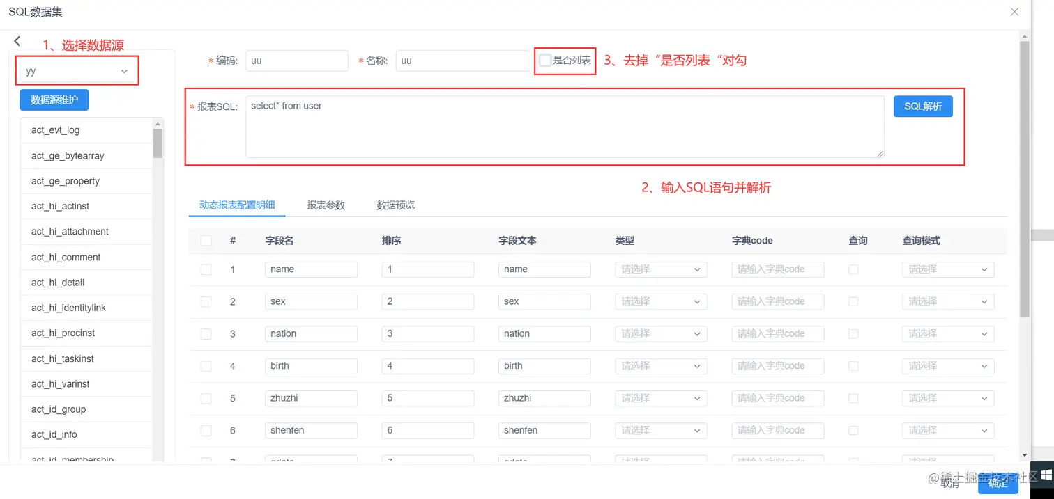 - 点击“数据集管理 ->SQL数据集”,进入数据集管理界面,添加user表,并解析数据;