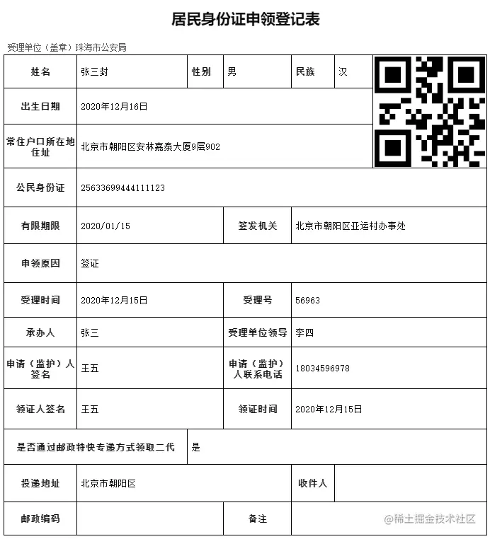 某政府机构需要做一张居民身份证申领登记表,需要把相关信息打印给客户,同时在每个打印单上配有一个可查询申领进度的二维码,不需要用户登录,直接扫描就可看查看;