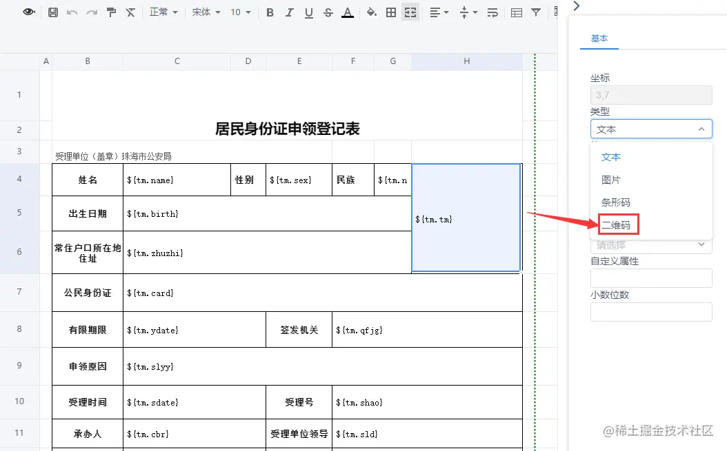 选中二维码字段单元格,在右侧将单元格类型设置为“二维码”,就可以渲染出二维码样式了;