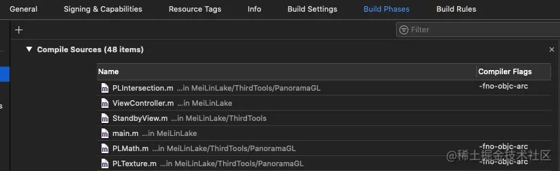 因为PanoramaGL用的是MRC,在现在ARC环境下会报错,所以找到targets->build phases->compile sources里的PanoramaGL相关文件添加