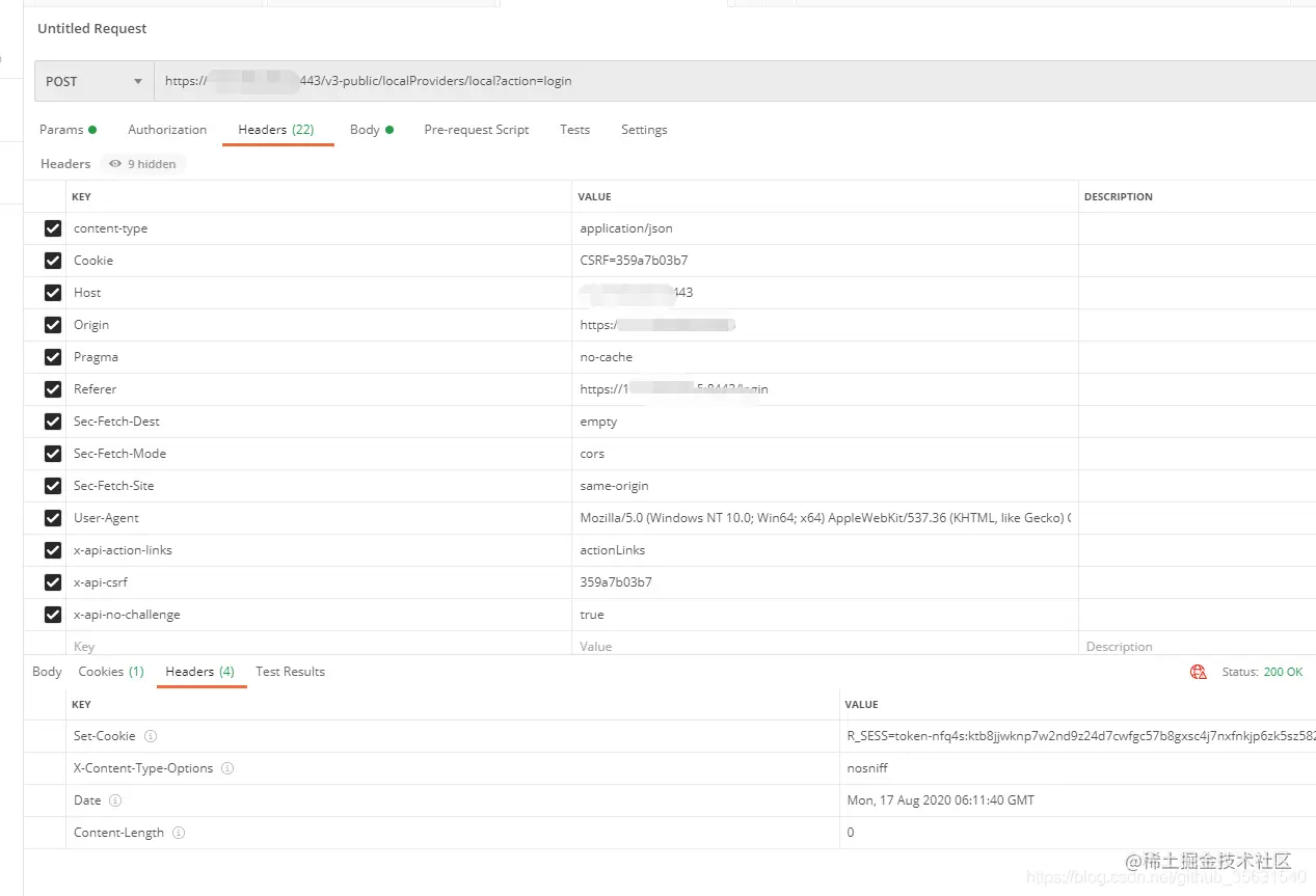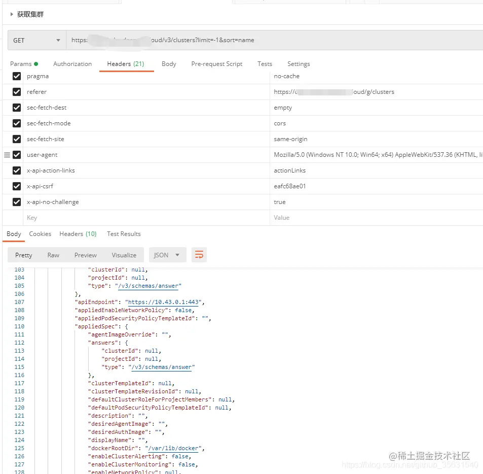rancher API 使用Postman模拟 TopFE 2021-02-25 442 阅读1分钟 登录接口,没有返回值, 但设置了Cookie R_SESS是一个很重要的字段,在rancher调用接口时都要有该字段 另外一个重要的字段是 x-api-csrf 貌似是为了处理跨域 主要在postman里需要禁用SSL验证。 Body 选raw json 获取集群