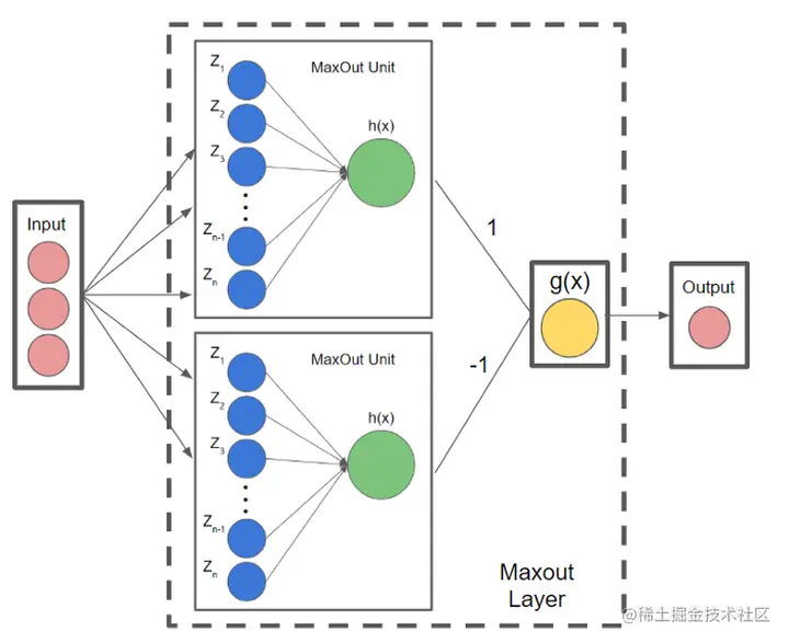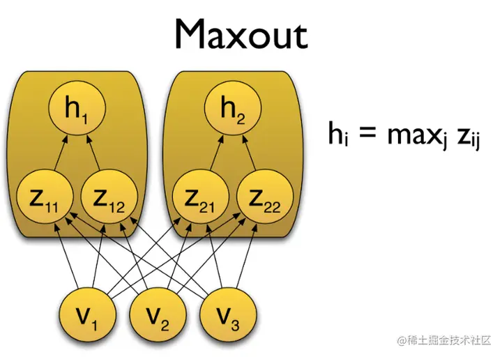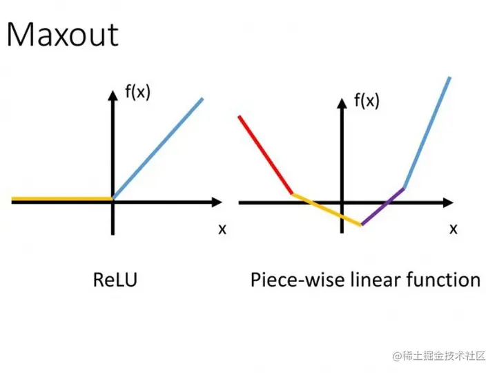 在 Maxout 层,激活函数是输入的最大值,因此只有 2 个 maxout 节点的多层感知机就可以拟合任意的凸函数。
