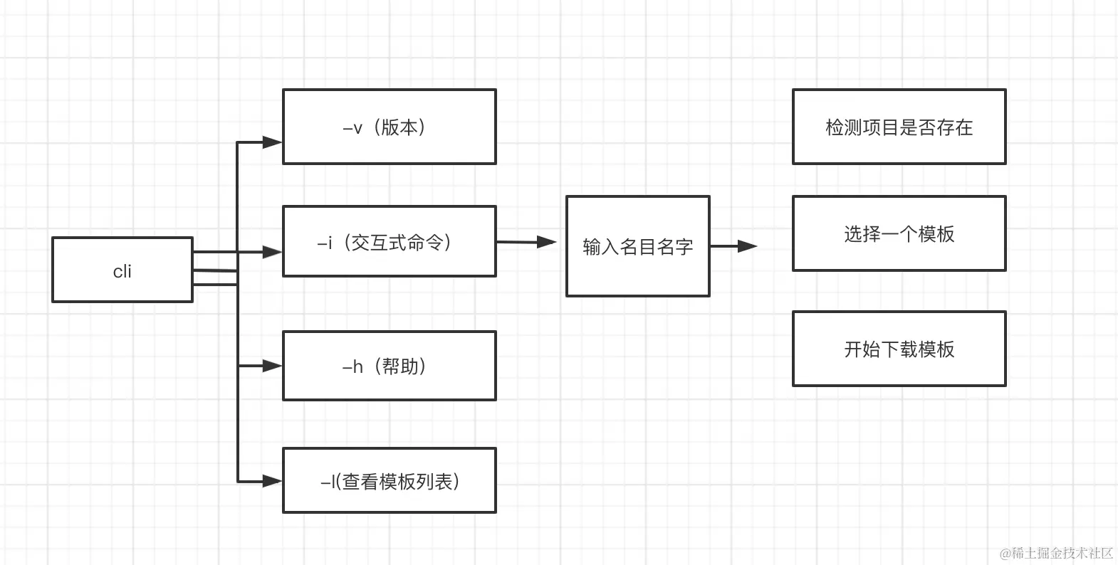 const program = require("commander") const pkg = require("../package.json") program .version(pkg.version) .usage(`cli`) .option("-i, --init", "初始化项目") .option("-v, --version", "查看版本号信息") .option("-l, --list", "查看可用模版列表")- 执行 用户输入不同命令的脚本