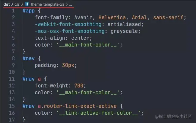 打开 theme_template.css,主题相关的变量已经替换为占位符,当然替换的时候需要特别注意,不仅要替换占位符,也要将引号一并给替换了。