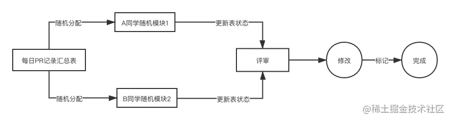 2、小版本方式提交PR、日常review,需要维护一张所有童鞋提交pr记录表、每天可以不定时间随机抽取某位同学pr review、并在表上维护状态