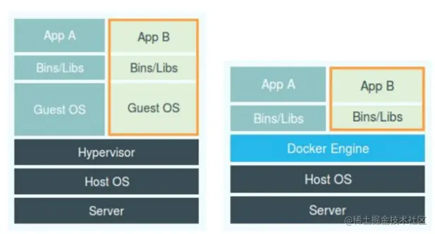 Docker 与虚拟机的差异体现在进程隔离方式的不同,Docker 通过为应用附加额外设置的Namespace参数实现进程的隔离,并没有一个真正的”Docker容器“运行在宿主机中,这样的“障眼法”操作让进程仿佛运行在一个与世隔绝的“容器”里面,使得容器减少了额外的资源消耗和占用,在敏捷和高性能方面具有很大优势。