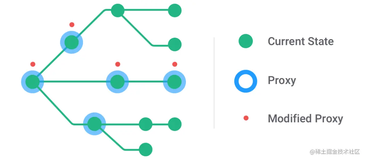 当produce最终结束时,它将仅遍历代理树,如果修改了代理,则将其复制。 或者,如果不进行修改,则仅返回原始节点。 下图是对Proxy作用的图示说明。
