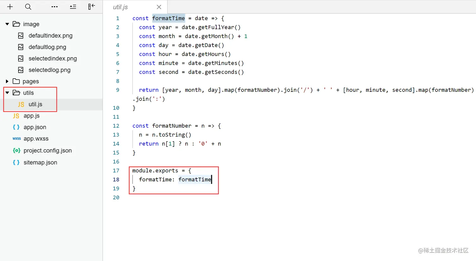 工具类文件对应一些常用的js工具处理。在小程序框架目录中又一个utils文件夹,用于存放工具类的函数,例如日期格式化函数、时间格式化函数等常用得函数。定义完这些函数后,要通过module.exports将定义得函数名称进行注册。这样才可以在其他得页面上使用。如下图所示: