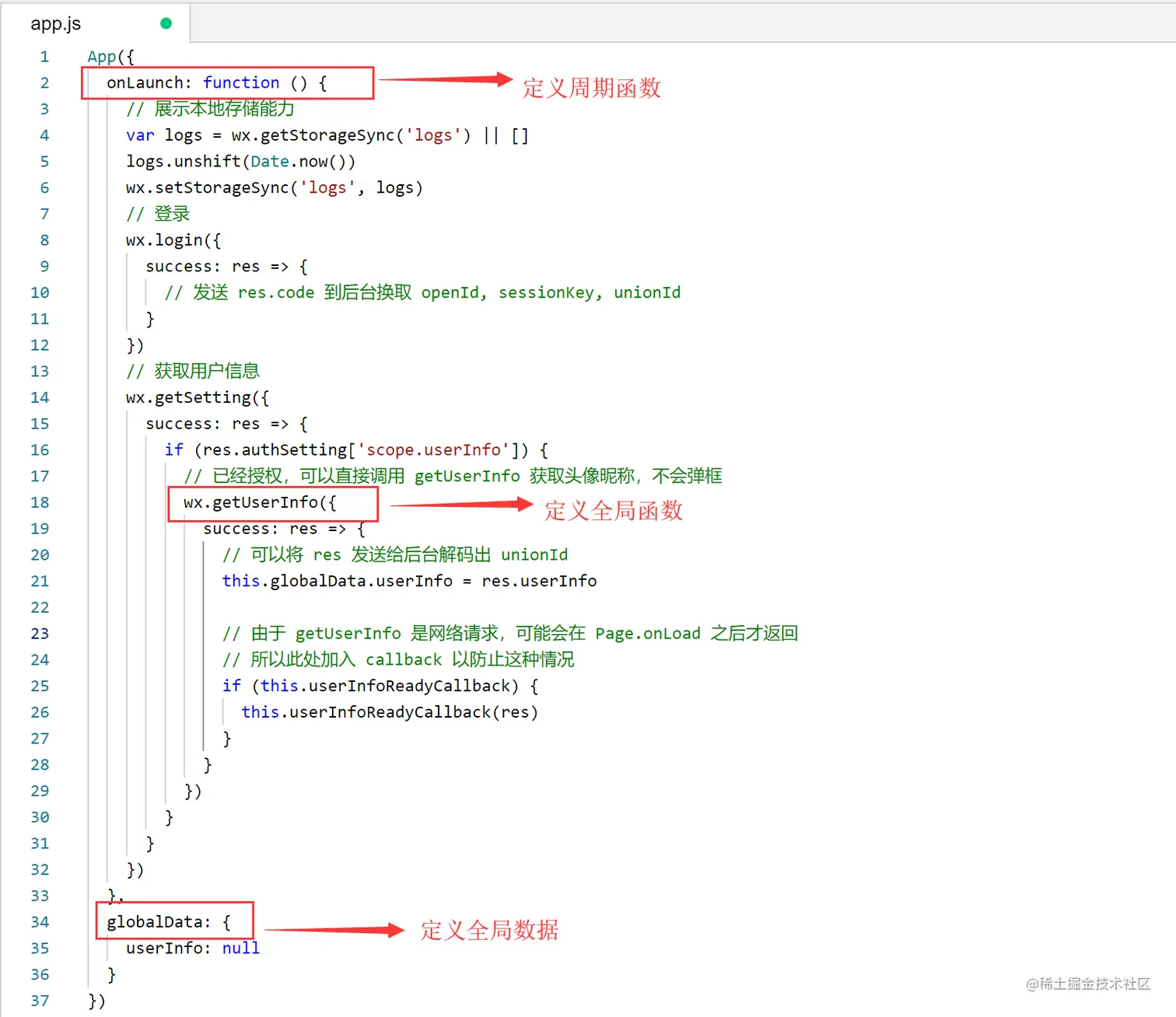 可以指定小程序的生命周期。如OnLaunch(监听小程序初始化)、OnShow(监听小程序显示)、OnHide(监听小程序隐藏)等。同时可以定义全局函数和定义全局数据,其他的页面引用App.js文件后就可以直接使用全局函数和数据。如下图所示: