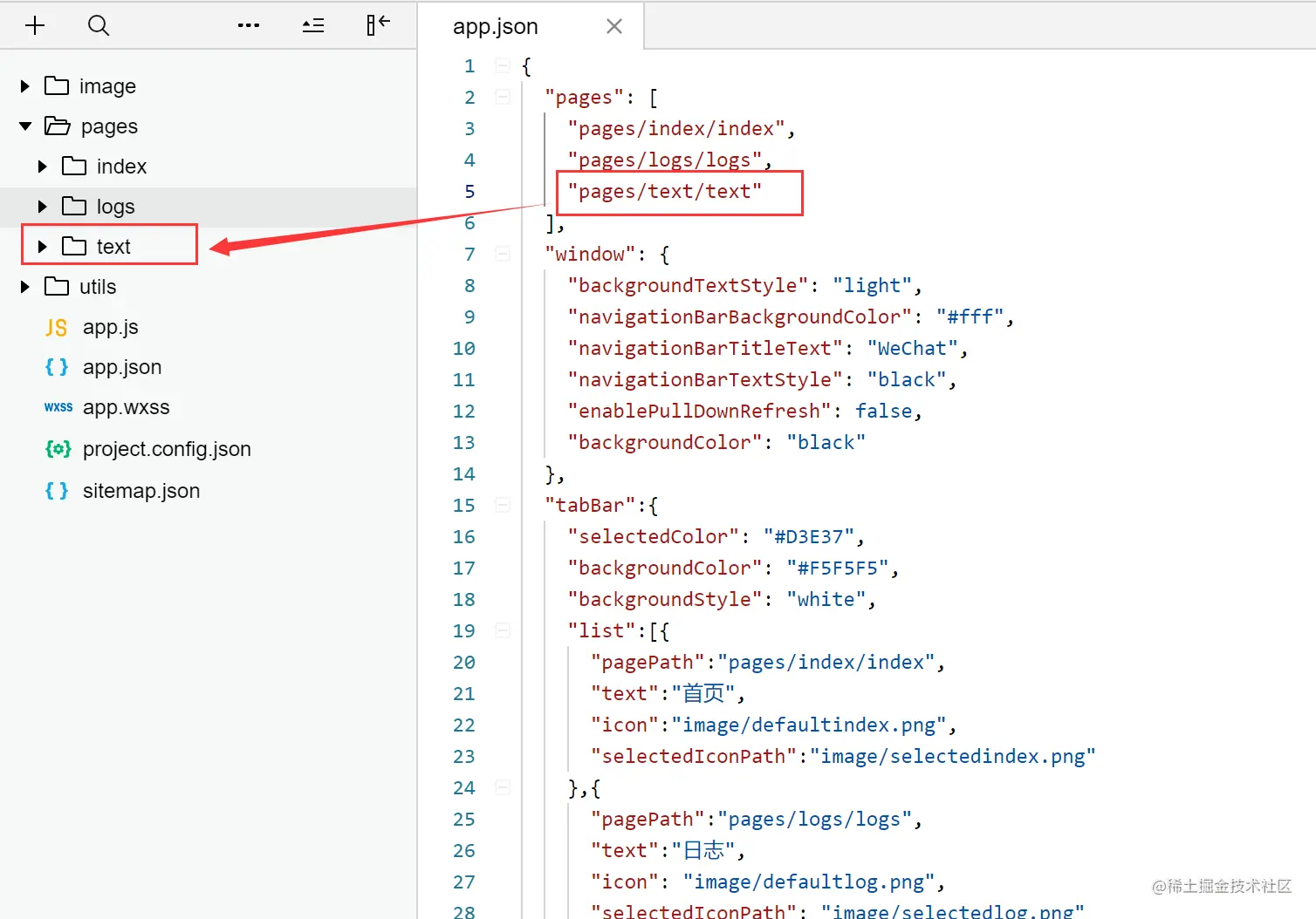 【3】配置标签导航 tabBar是一个对象,可以配置标签导航文字默认颜色、选中颜色、标签导航背景色及上边框颜色,上边框颜色可以配置black、white两种颜色。标签导航存放在list数组中,由一个标签导航就在list中配置标签导航、list中的每个对象对应一个标签导航、每个对象中可以配置标签导航的路径、导航名称、默认图标及选中图标。