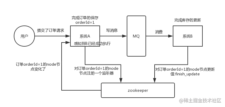 这个其实是 zookeeper 很经典的一个用法,简单来说,就好比,你 A 系统发送个请求到 mq,然后 B 系统消息消费之后处理了。那 A 系统如何知道 B 系统的处理结果?用 zookeeper 就可以实现分布式系统之间的协调工作。A 系统发送请求之后可以在 zookeeper 上对某个节点的值注册个监听器,一旦 B 系统处理完了就修改 zookeeper 那个节点的值,A 系统立马就可以收到通知,完美解决。