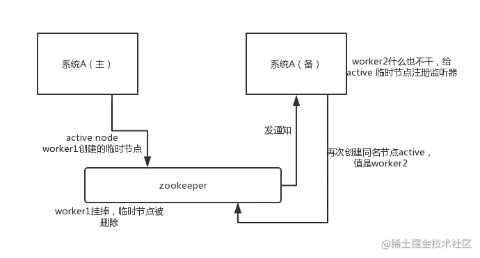 这个应该是很常见的,比如 hadoop、hdfs、yarn 等很多大数据系统,都选择基于 zookeeper 来开发 HA 高可用机制,就是一个重要进程一般会做主备两个,主进程挂了立马通过 zookeeper 感知到切换到备用进程。