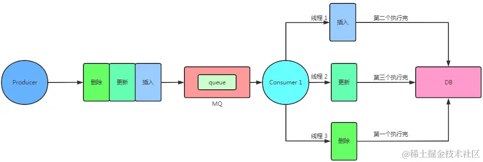 一个 queue 对应一个 consumer,但是 consumer 里面进行了多线程消费,这样也会造成消息消费顺序错误。\
