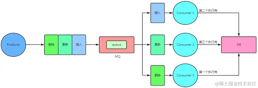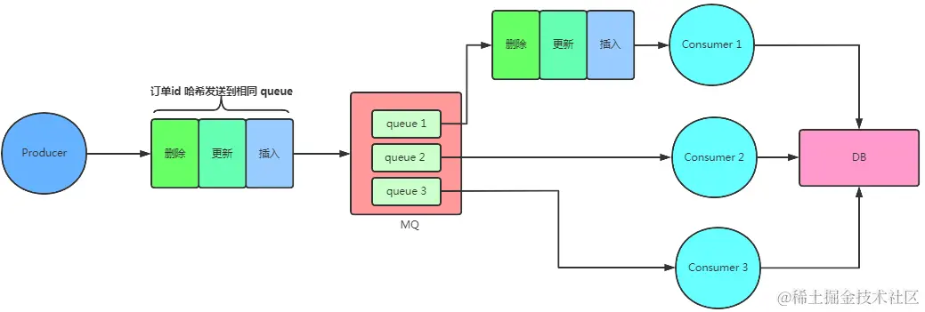 一个 queue 对应一个 consumer,在 consumer 内部根据ID映射到不同内存队列,然后用内存队列做排队 分发给底层不同的 worker 来处理\