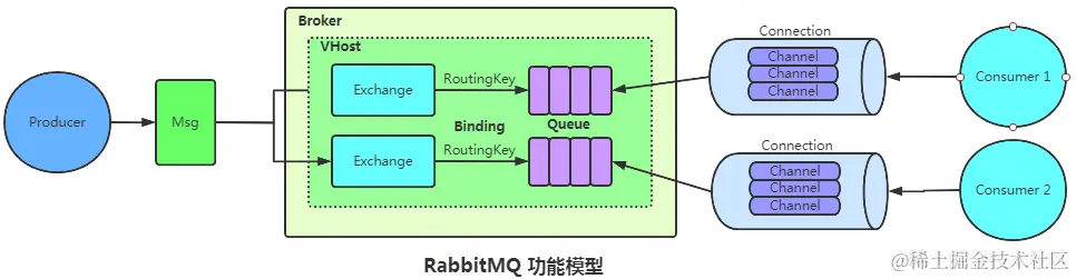 - VHost:vhost 可以理解为虚拟 broker ,即 mini-RabbitMQ server。其内部均含有独立的 queue、exchange 和 binding 等,但最最重要的是,其拥有独立的权限系统,可以做到 vhost 范围的用户控制。当然,从 RabbitMQ 的全局角度,vhost 可以作为不同权限隔离的手段(一个典型的例子就是不同的应用可以跑在不同的 vhost 中)。
