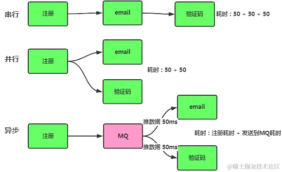 串行方式,依次执行,问题是用户注册后就可以使用了,没必要等短信跟邮件啊。