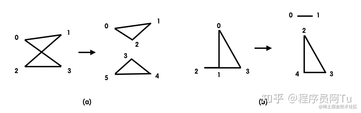 三角剖分在使用时有一个前置条件:使用对象必须为简单多边形,即多边形中的任何两条边仅可以在顶点处相交。下图(a)多边形为满足定义的简单多边形,图(b)多边形边01和23在非顶点处相交,因此是非简单多边形。