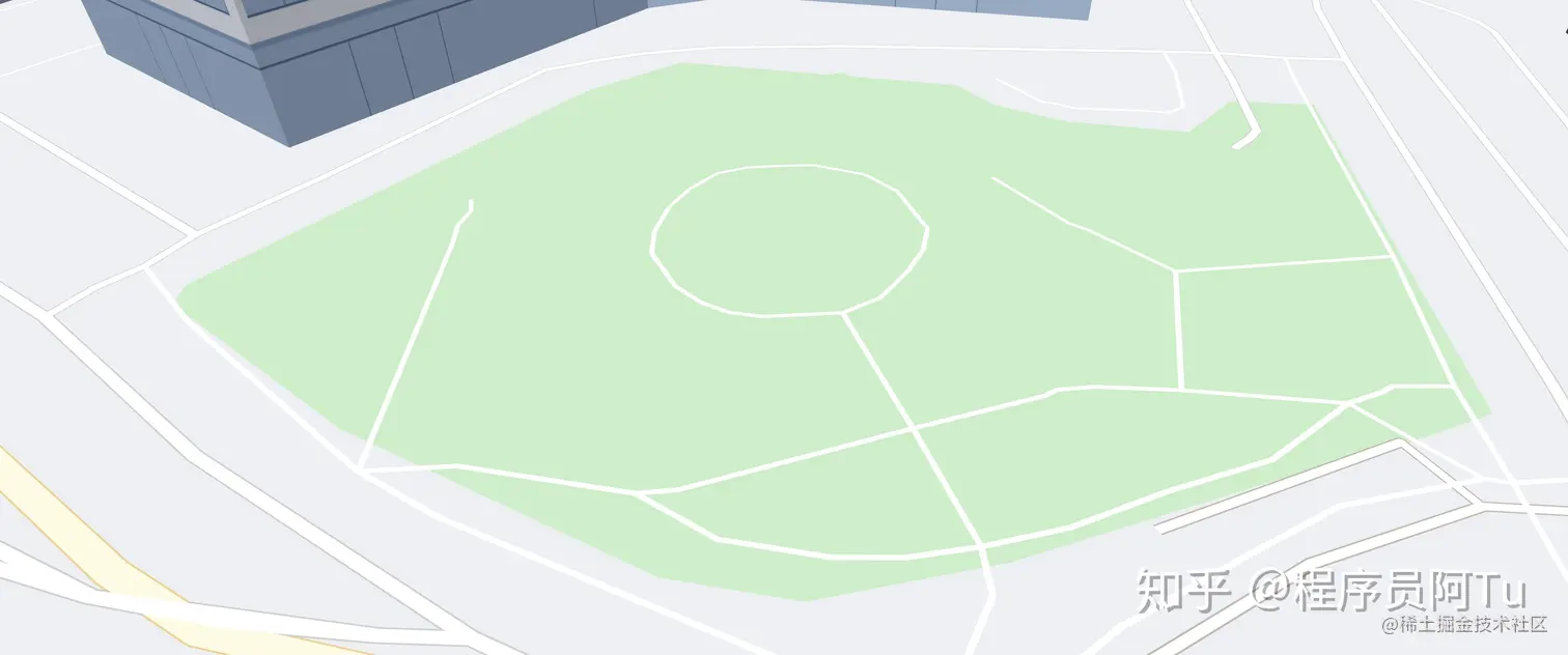 剖分完成的多边形区域,在指定了每一个顶点的颜色之后,就能绘制得到纯色的面。和道路线的Z-fighting问题类似,区域面也需要处理同一高度叠加显示的问题。同时,二维的道路线和区域面整体也处于同一个高度上,因此也需要统一考虑层级关系,将所有的道路线置于区域面之上。统一处理完成就可以得到二维的地图底板了。