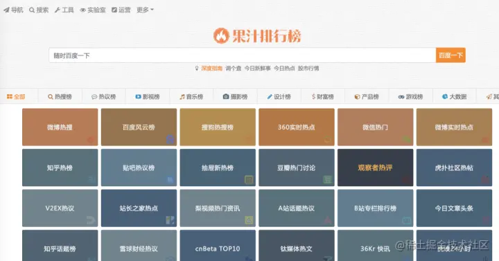 如果你在网上冲浪,想同时看很多个榜单的热搜,在这里推荐果汁排行榜,种类繁多,包括平台话题、影视榜、音乐、产品、财富榜等等。
