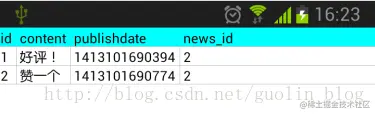 其中,调用 ContentValues 的 put() 方法来添加待存储数据,put() 方法接收两个参数,第一个参数是数据库表中对应的列名,第二个参数就是要存储的值,最后调用一下 insert() 方法,这条新闻就会插入到 news 表当中了,并且该数据行对应的 id 会作为返回值进行返回。