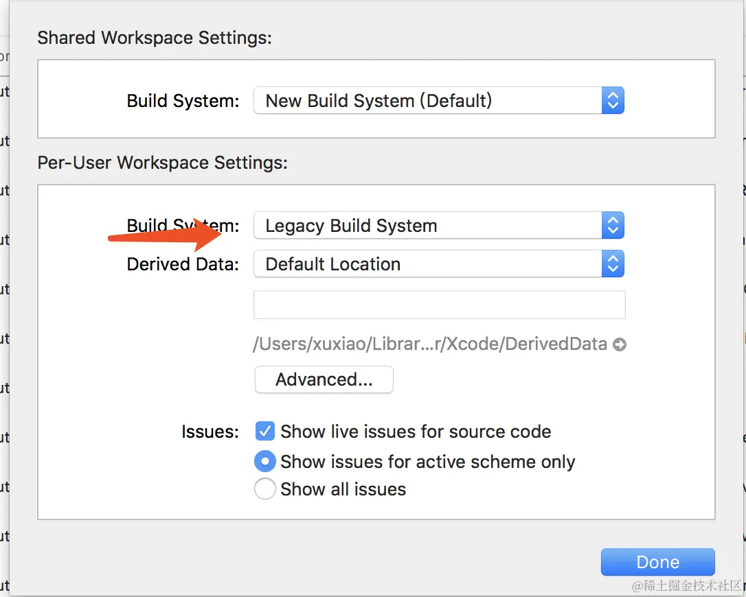 升级Xcode10运行报错Multiple commands produce 解决 初_夏 2021-02-25 194 阅读1分钟 升级到 Xcode10 后,如果运行模拟器或者真机均报错 Multiple commands produce / 路径,按以下步骤即可解决: 打开 File—Workspace Settings image.png 2.Bulid System:Use Shared Setting 改成 Legacy Build System image.png 重新运行报错就会消失