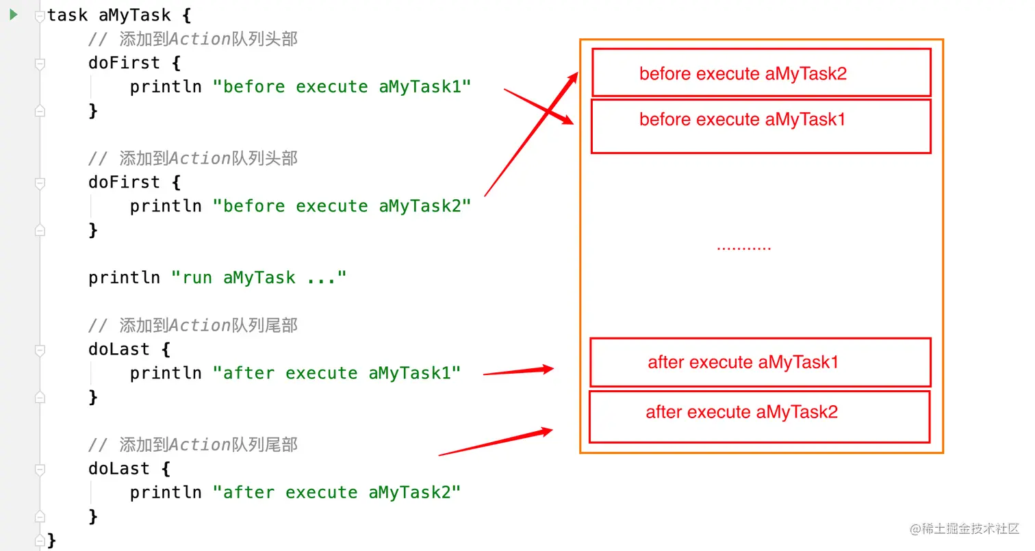 println "run aMyTask"这句代码并不是在队列的中间执行,这句代码是在配置阶段执行的,所有直接在 Task 里写的动作并不会添加到 Task 的 Action 列表中,只会当做 Task 的配置信息执行,所以声明周期一定要搞清楚。!